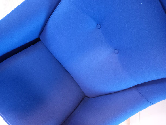 Deze zetel zorgt voor dé gezellige en gedurfde toets. De mooie draaifauteuil uit de jaren '60 is echt een eye catcher. Het kleur is diepblauw met een hint paars.